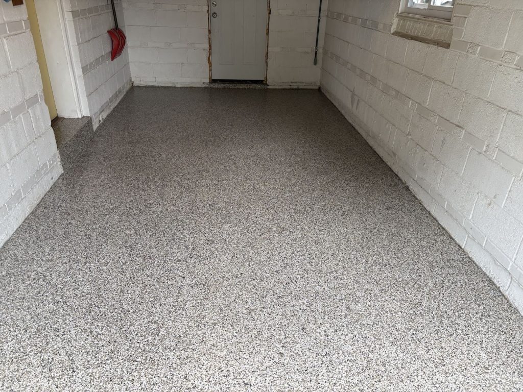 We began by grinding the surface to remove the remaining paint and prepare the concrete for maximum adhesion. Once the surface was clean and smooth, we applied our base coat, broadcast decorative chip for texture and color, and sealed it all with a clear topcoat that adds shine and protection.