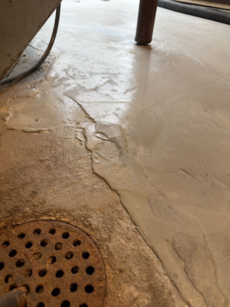 Under the surface was nearly an inch of self-leveler, but it hadn’t been mixed properly before being poured. Instead of curing evenly, it set up inconsistently, creating weak spots, ridges, and failure points.